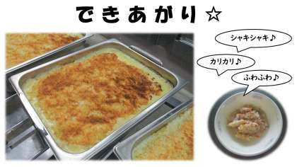 パン粉をまんべんなくまぶしたり,こんがりとした焼き目がつくまでスチコンで焼いたり,調理室では子どもたちによりおいしく味わって食べてもらうための給食調理員さんの工夫をたくさん見ることができます。