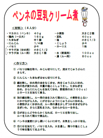 今回紹介する献立は,今日の給食に登場した「ペンネの豆乳グラタン」によく似た「ペンネの豆乳クリーム煮」です。この献立は,オーブンがなくてもフライパンや鍋を使って作ることができます。