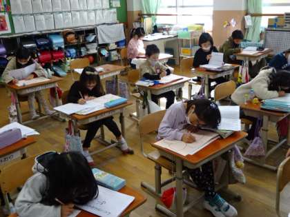 国語では「わたしはおねえさん」の学習のまとめの時間で,自分で読んだ本についてテーマに沿ってまとめていました。