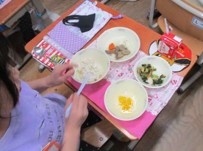 今日は,今年度初めての「フルーツ寒天」が登場しました。盛り付けるときはトロトロとした液状ですが,食べるころにはプルプルとした固体に変身します。初めて食べる1年生は,「ほんまや。かたまってる!」「ゼリーみたいにプルプルや!」など,固まるまでの様子を興味深く見ていました。