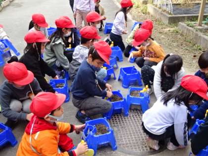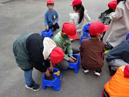 1年生はチューリップの球根を植えました。これからしっかりと育て,卒業式や来年の入学式で咲いた花を並べられたらいいなと思います。
