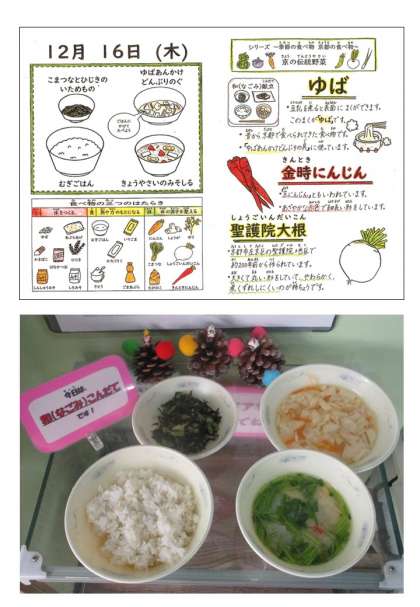 「京野菜のみそ汁」には,冬においしい京野菜の「聖護院だいこん」「金時にんじん」と,季節の野菜「せり」を使いました。彩りもよく,見た目で楽しむこともできましたね。