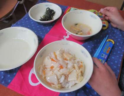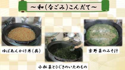 今日は,月に一度の和(なごみ)献立の日です。「ゆばあんかけ丼(具)」は,4年ぶりの登場で,食べたことがない子がほとんどでした。かつおぶしでとっただしで,ゆば・たけのこ・にんじん・かまぼこを煮てとろみをつけ,最後にしょうがのしぼり汁を加えてあんかけ丼の具にしました。だしのうま味やゆばのあま味,しょうがの香りがごはんとよく合う一品でした。