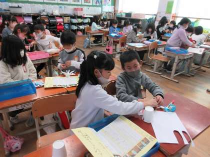 国語科の学習で一生懸命に書いた手作りおもちゃの「作り方せつめいカード」を1年生に披露し,それを一緒に読みながらおもちゃ作りをしてみました。
