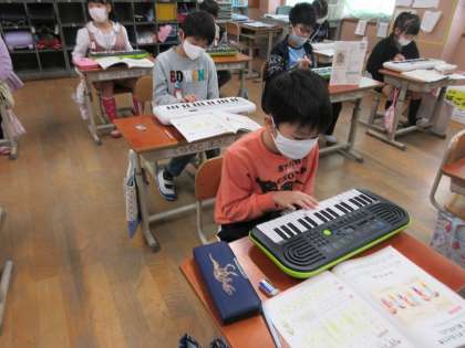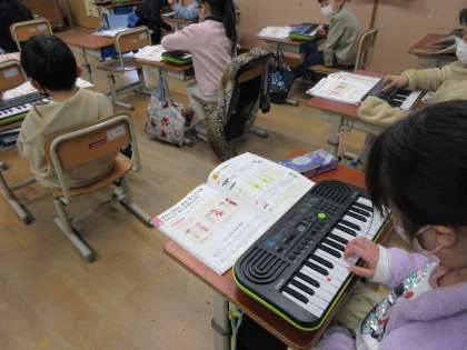 音楽科の学習では,鍵盤ハーモニカを吹くことができないので,代わりに,ミニキーボードを使って,鍵盤楽器で演奏する学習をしています。