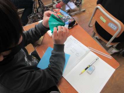 まだ分度器は使わないのですが,その導入として折り紙を使って扇を作りました。