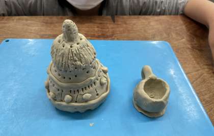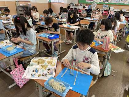 図工科で「切ってかき出しくっつけて」の学習をしました。ねん土の形をかえたり,かきべらなどを使ってあなを作ったり,できた形を組合わせたりし,自分だけの形を作りました。