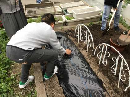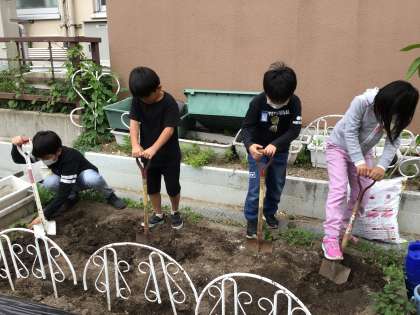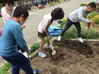 畑を耕して,夏野菜の苗を植えました。今年は,トマト・ピーマン・万願寺唐辛子・スイカを植えました。畑を耕すときは,みんなで協力して,スコップで土を柔らかくすることができました。