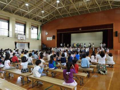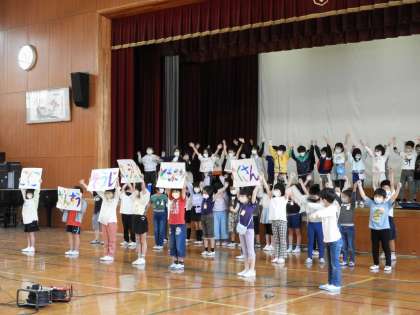 昨年度は迎えてもらう立場でしたが,今年度はお兄さん・お姉さんとして1年生の入学をお祝いする気持ちをもって,迎える立場でした。1年生に楽しんでもらうためにダンス・手遊び歌で小学校の楽しさを伝えました。緊張しながらも一生懸命がんばる素敵な姿が見られました。これから,1年生と一緒に楽しい思い出をたくさん作っていきたいと思います。