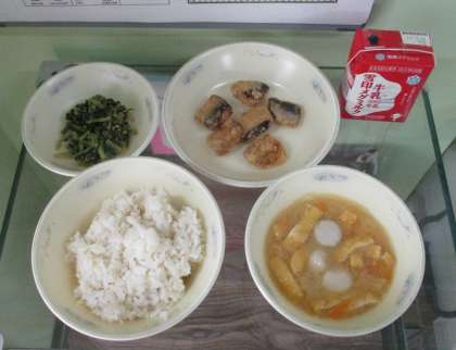 あげたての「いわしのこはくあげ」は,衣がサクサクしていてとてもおいしかったですね。1年生も,ごはんと一緒に味わいながら食べていました♪