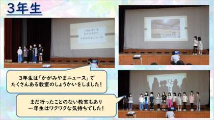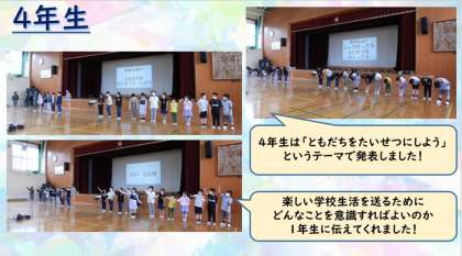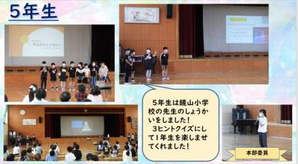 たいよう学級からは,キーホルダーのプレゼント。二年生からは,歌のプレゼント。三年生からは,学校の教室の紹介。四年生からは,より良い友達との関わり方についての紹介。五年生からは,鏡山小学校の先生の紹介。六年生からは,委員会や部活動,学校行事,給食についての紹介がありました。