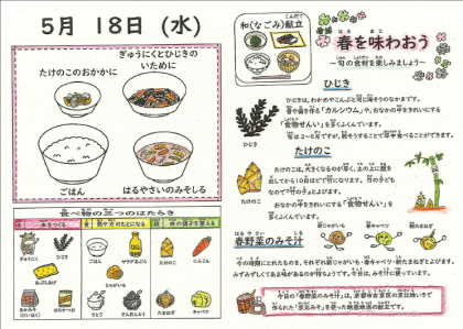 「春野菜のみそ汁」は,春が旬のキャベツ・じゃがいも・たまねぎをみそ汁の実として取り入れています。この時期に収穫されるものは,新キャベツ・新じゃがいも・新たまねぎ・と言われ,水分が多く甘みが強いのが特徴です。京北産の京北みそを使った地産地消の献立です。