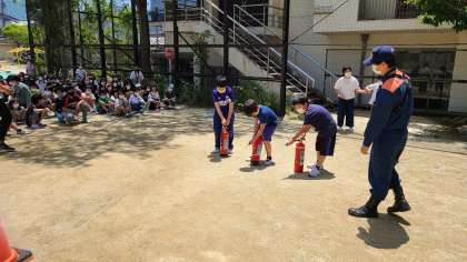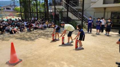 運動場に集合したあとは,4年生は消火器体験をしました。