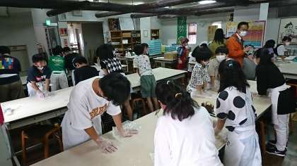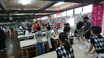 音楽にあわせて今度はお土産の生地を粉からつくります。のりのりに躍りながらのうどんづくりです。