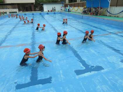 曇り空でしたが,今日は無事に水あそびの学習を行うことができました。久しぶりの学習だったので,みんな楽しそうでした。肩をもって電車ごっこをしたり,水中じゃんけんをしたりしてたくさん潜りました。