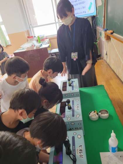 毎日石鹸で洗っていても,つめの間や手首は洗い残しが多いことを知った1年生。