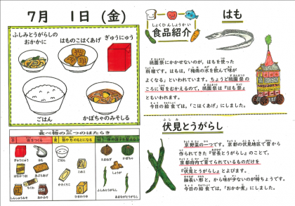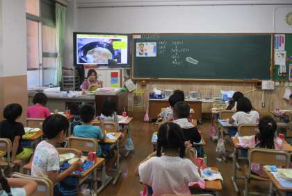 教室では,「はものこはくあげ」の調理の様子を動画で見ました。大きな釜や、はもの量に驚いた様子の子どもたち。「魚は苦手だけど、これなら食べられる!」「すごく食べやすい!」などと、おいしそうに食べていました。