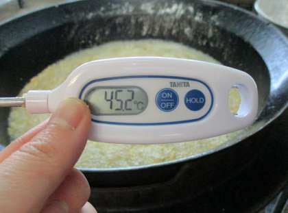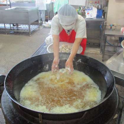 揚げ物をしている釜の近くでは、気温がなんと45度に!!調理中は、虫が入らないように窓や扉をしめているので、「蒸し風呂」のように暑くなります。