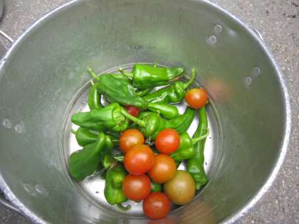 満願寺・ピーマン・ミニトマトが収穫できました。明日はピザづくりです。