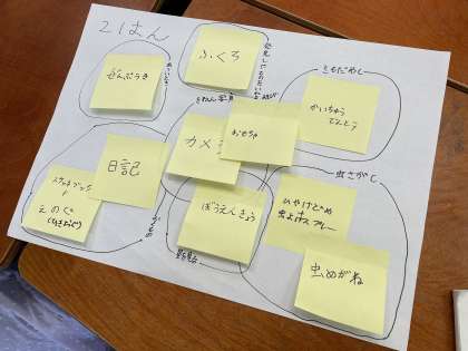 国語科で「三日間山小屋ですごすなら」の学習をしています。普段子どもだけではできないことをして、自然と触れ合うなら、どんなものを持っていきたいか、食料、水、着替えの決まった持ち物の他に五つまで持って行くことができるというルールです。今日は、グループでしたいこと、持って行きたい物をたくさん出し合い、出された考えを仲間分けして整理しました。