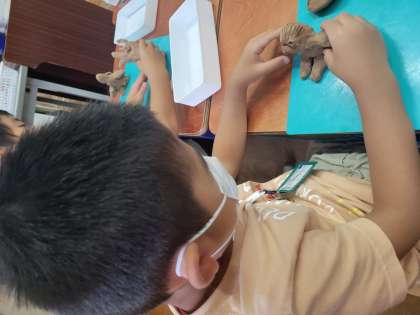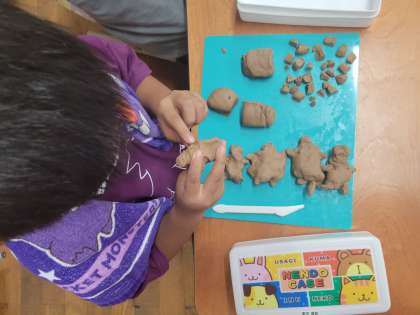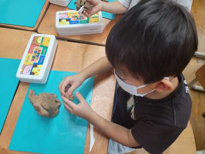 粘土の塊をつまんだり、ひっぱったりして作品をつくりました。