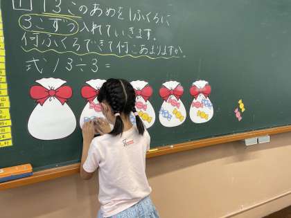算数科で「あまりのあるわり算」の学習に入りました。数図ブロックなどの具体物操作を通して、あまりのあるわり算の計算の答えを出した後、数図ブロックを使わないであまりのあるわり算の答えを見つける方法を考えました。