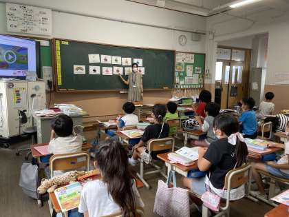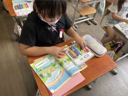 外国語でUnit4「I like blue.」の学習に入りました。教科書の虹に色をぬって、自分なりの虹を完成させ、世界の子どもたちが描いた虹と自分の描いた虹を比べました。世界の子どもたちの虹の表し方はさまざまで、自分の虹と同じところや違うところに気が付いたり、世界の国々への理解を深めることができました。