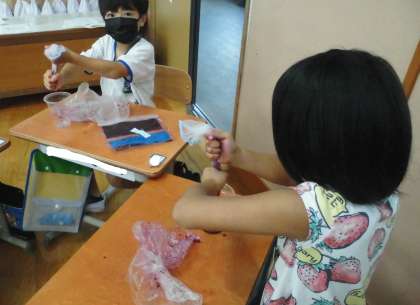夏休みに集めていたアサガオの花をつかい、ジュース屋さんをしました。「ギュウっとしぼると濃い色水ができるよ。」「水を入れるとどうなるろう。」いろいろな色の色水ができてました。