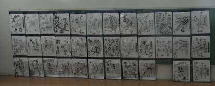 夏休みを振り返り、心に残ったことを書きました。字の大きさや書き方を工夫したり絵を描くように筆を使ったりしていた子もいます。あふれる思いが伝わってきました。