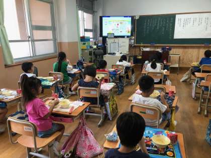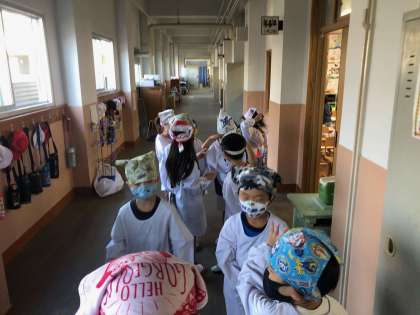 最近の給食時間は、当番の子どもたちの着替えるスピードが速くなり、皆が黙食できるようにもなりました。