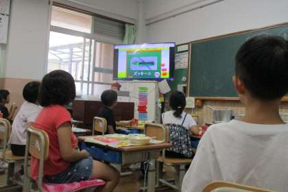 「イタリアンスパゲティ」は、ズッキーニやピーマンなどの夏野菜を使用した夏限定の献立です。給食時間には、「給食クイズ」をしました。ズッキーニは、かぼちゃの仲間と知って驚いた様子の子どもたち。「きゅうりの仲間かと思った!」「よく見たら皮の部分がかぼちゃに似ている!」「すいかにも似ているね」などの声が上がっていました。