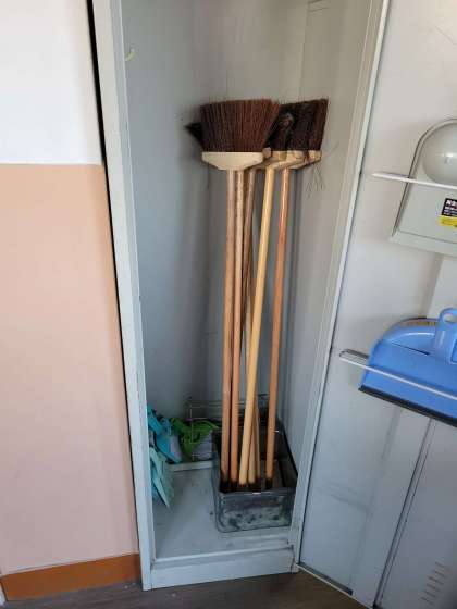 子どもたちが下校した後の教室を見てみると、掃除ロッカーや本棚、ぞうきんかけ、トイレのスリッパなどが気持ちよくそろっていました。
