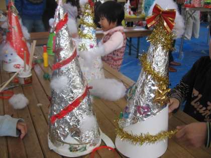 厚紙を利用して円すい形にした土台に,色とりどりの飾りつけ用の材料を思いを巡らせながら工夫して取り付けていました。出来上がったオリジナルのツリーの出来栄えを,みんなで見合っていました。楽しいひと時を過ごした子ども達の顔はとてもうれしそうでした。