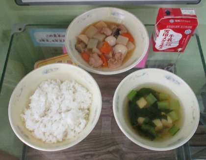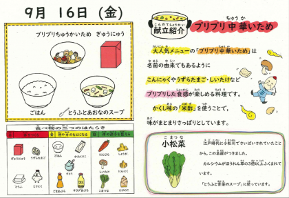 火曜日の給食は、台風接近にそなえて献立を変更して実施いたします。詳しくは、本日配布しましたプリントをご覧ください。