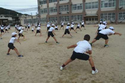 今日初めて、グラウンドで1組2組合同でソーラン節を練習しました。
