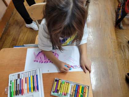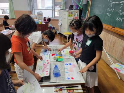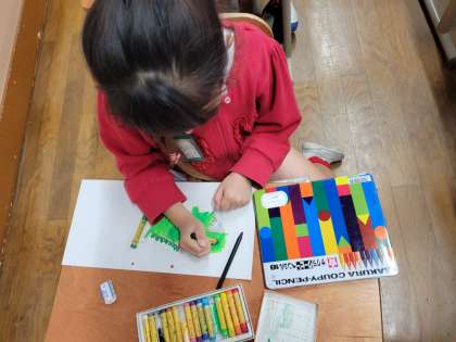 学級ごとに絵本を選び、物語を聞いて想像したことを絵に表しています。