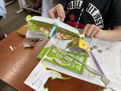 「重さ」の学習に入りました。重さは天びんを使って比べることができることを知り、1円玉何枚で鉛筆や定規などが釣り合うのかを調べました。また、1 円玉の重さは 1 枚1gだということを知り、鉛筆や定規などをgを使って表すことができました。