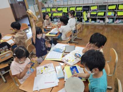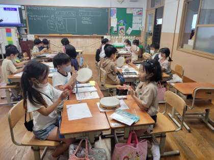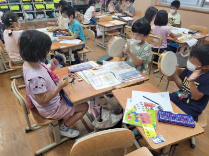 楽器の鳴らし方を変えるといろいろな音色が聞こえることに気が付いた子どもたち。