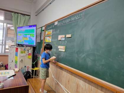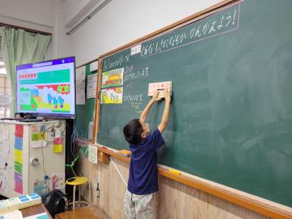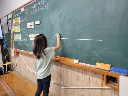 3つの数のたしざんで学習したことを生かして、自分たちで、めあてを考えたり、まとめの言葉を考えたりする子どもたち。