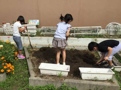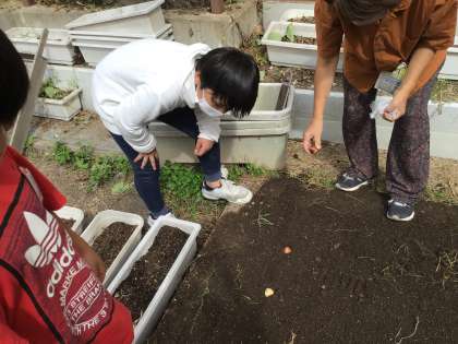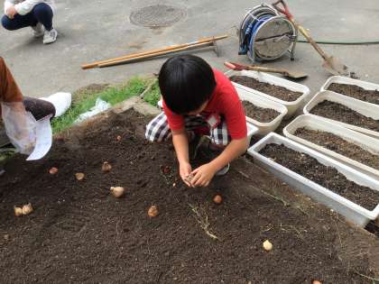夏野菜を育てていた畑を整備して春にさく花の球根を植えました。土を柔らかくしたり、肥料を混ぜたりする作業を一生懸命に頑張っていました。球根を植えるときには、丁寧に土をかぶせ、水やりをすることができました。