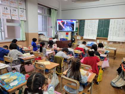 給食の時間に給食調理員さんが1つ1つ肉団子をまるめられている動画を見た1年生。