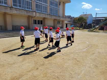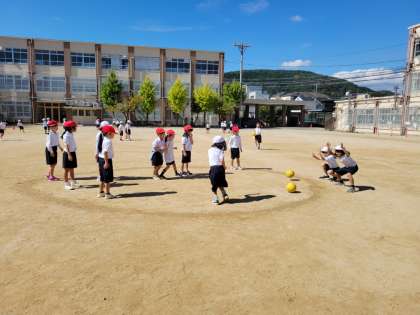 とびあそびで工夫したとび方をいかしながら、ころがしドッジボールをしました。