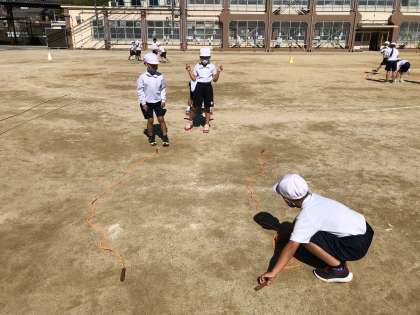 縄跳びで作った川をどう飛べば渡れるかを考えながら学習を進めました。川にいるワニに食べられないように頑張って渡り切ろうとする姿が多くみられました。