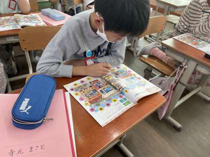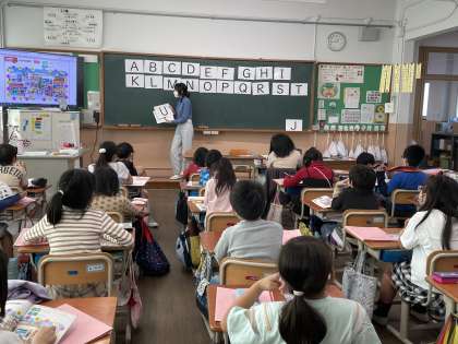 外国語活動「ALPHABET」の学習に入りました。歌やALTの先生に合わせて「ABCD〜♪」と楽しく発音しました。また、イラストの中から隠れたアルファベットを探しました。