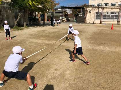 今日はじゃんけんとび遊びをした後に、ゴムとびをして色々高さに挑戦しました。膝のクッションを使って両足着地ができる子が増えてきました。