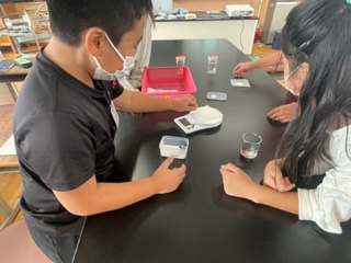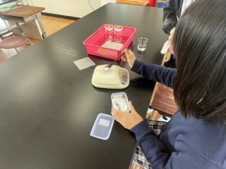 食塩や水の量をはかり、電子計りの使い方も素早くできるようなっています。食塩を紙の上に乗せるときにばらばらと散らばってしまうので、難しいようでした。