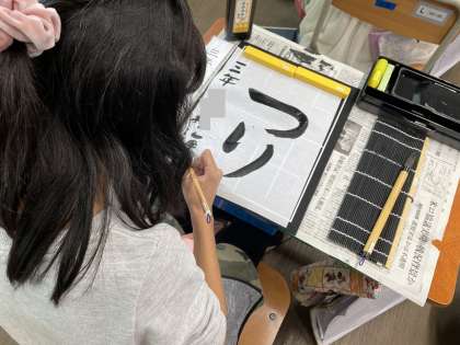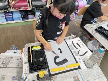 書写の学習でひらがなの筆使いに気をつけて「つり」を書きました。「つ」では、穂先の向きに気をつけ、筆の軸を回さないでゆっくり運んだり、「り」では、2画目へいくときに次につながるように筆を運んだり、はらいではだんだん力をぬいたり、といろいろな筆使いに気をつけながら書きました。