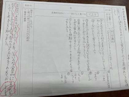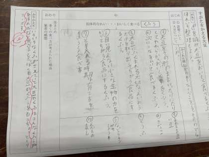 大豆にはおいしく食べるくふうがたくさんあることを学習し、いろいろな食品にすがたをかえていることに気がつきました。今日の学習を終えて「大豆のくふうをもっと知りたい」という思いをもつ子がたくさんいました。