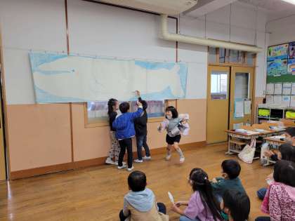 と、グループごとに、クジラぐもの上での会話を想像してストーリーを考えました。