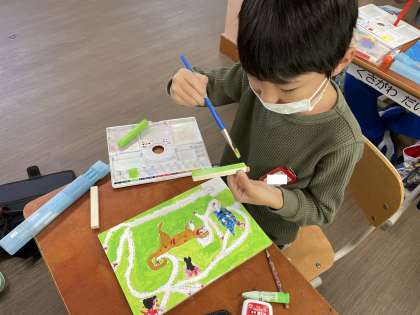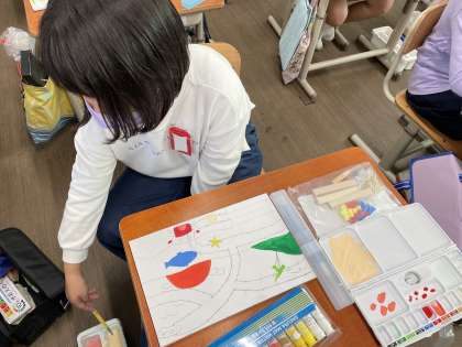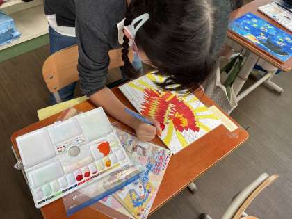 図画工作科の「くぎうちトントン」では、板にくぎを打ってコリントゲームや迷路ゲームを作るために、まず板に絵をかいています。仕上がりが楽しみです!